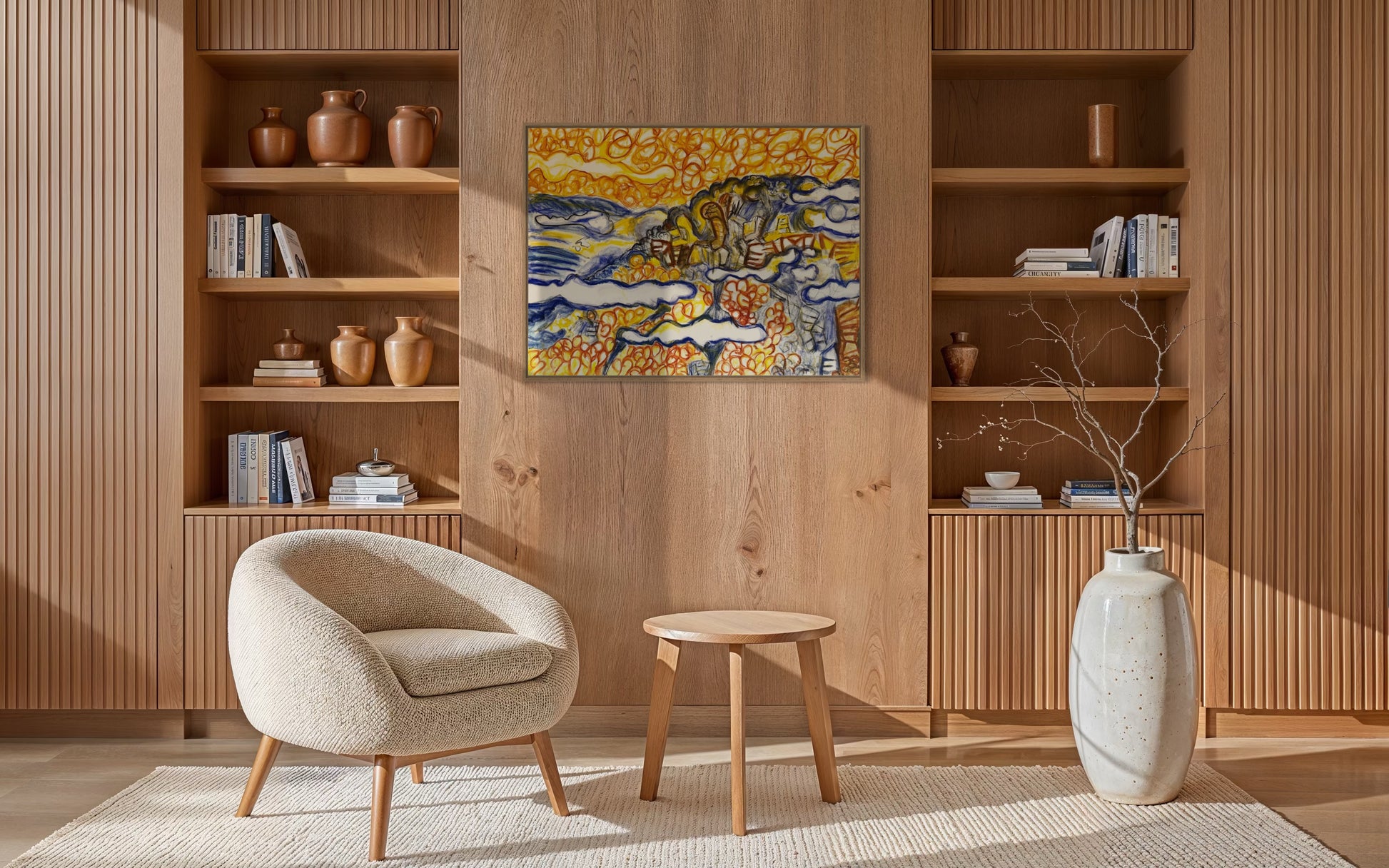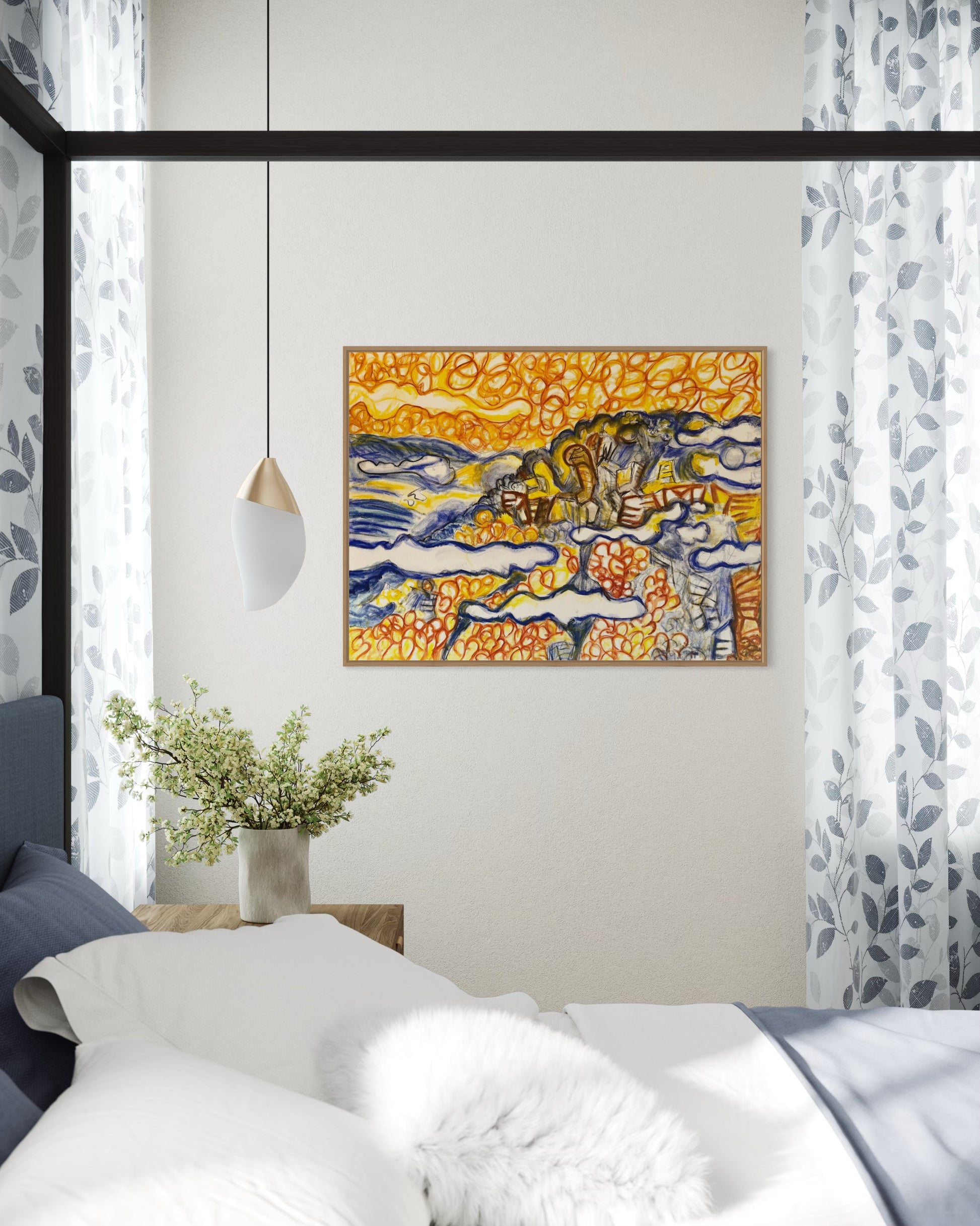 The cliffs are blue and distance disappears looking west past the mountains. Work in progress.