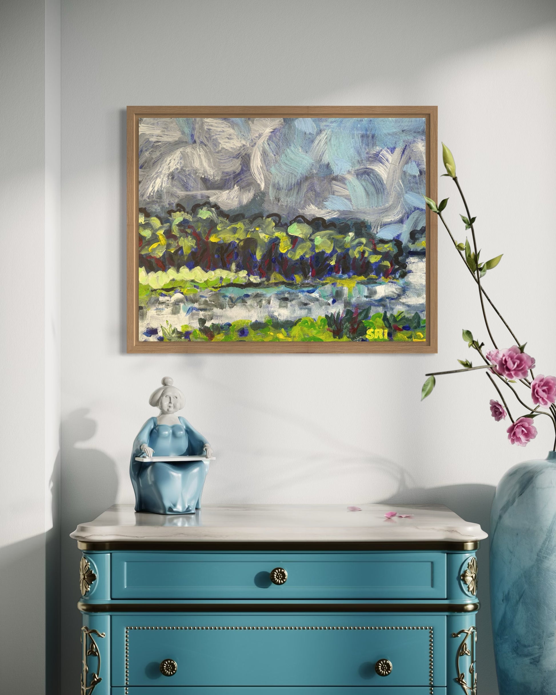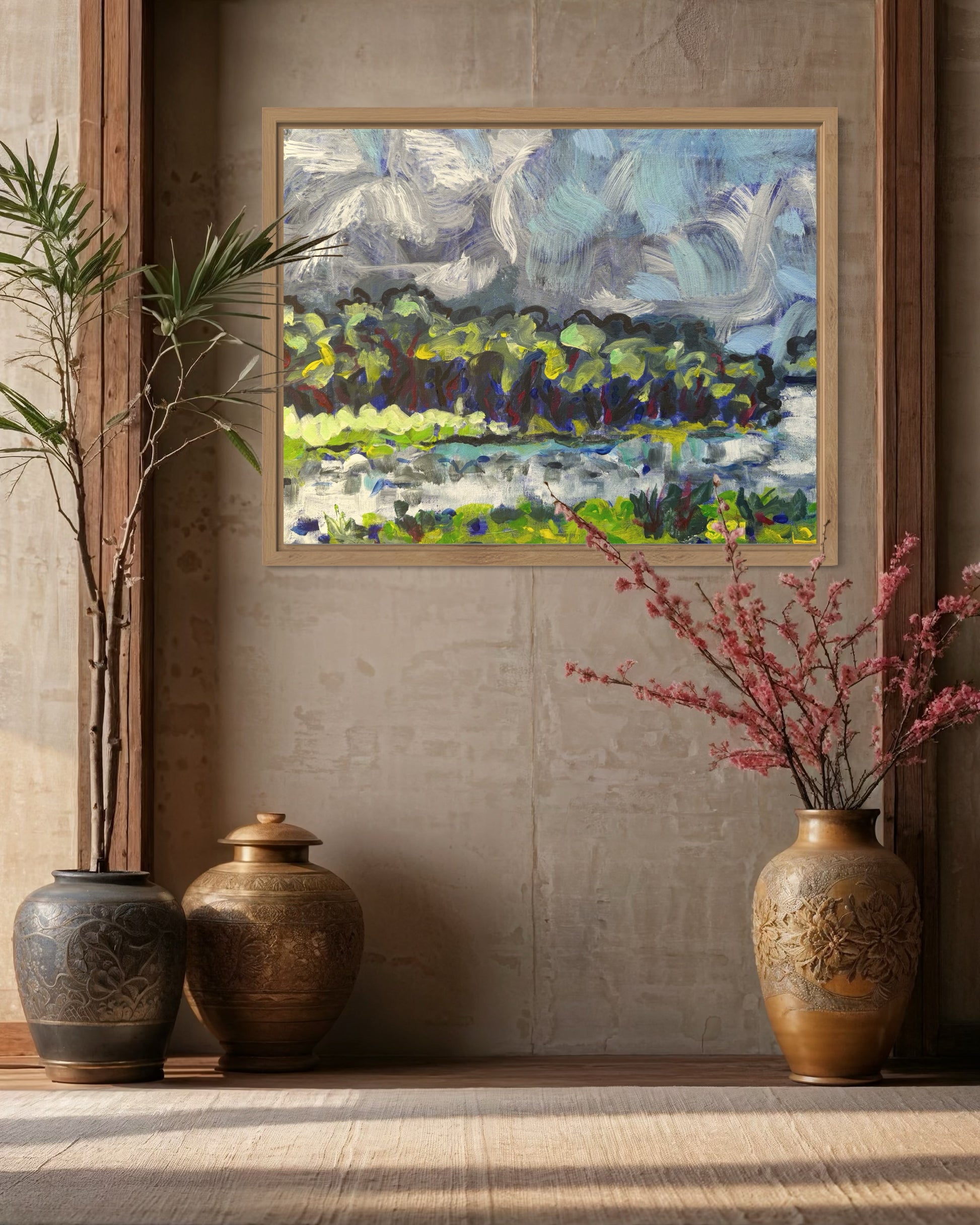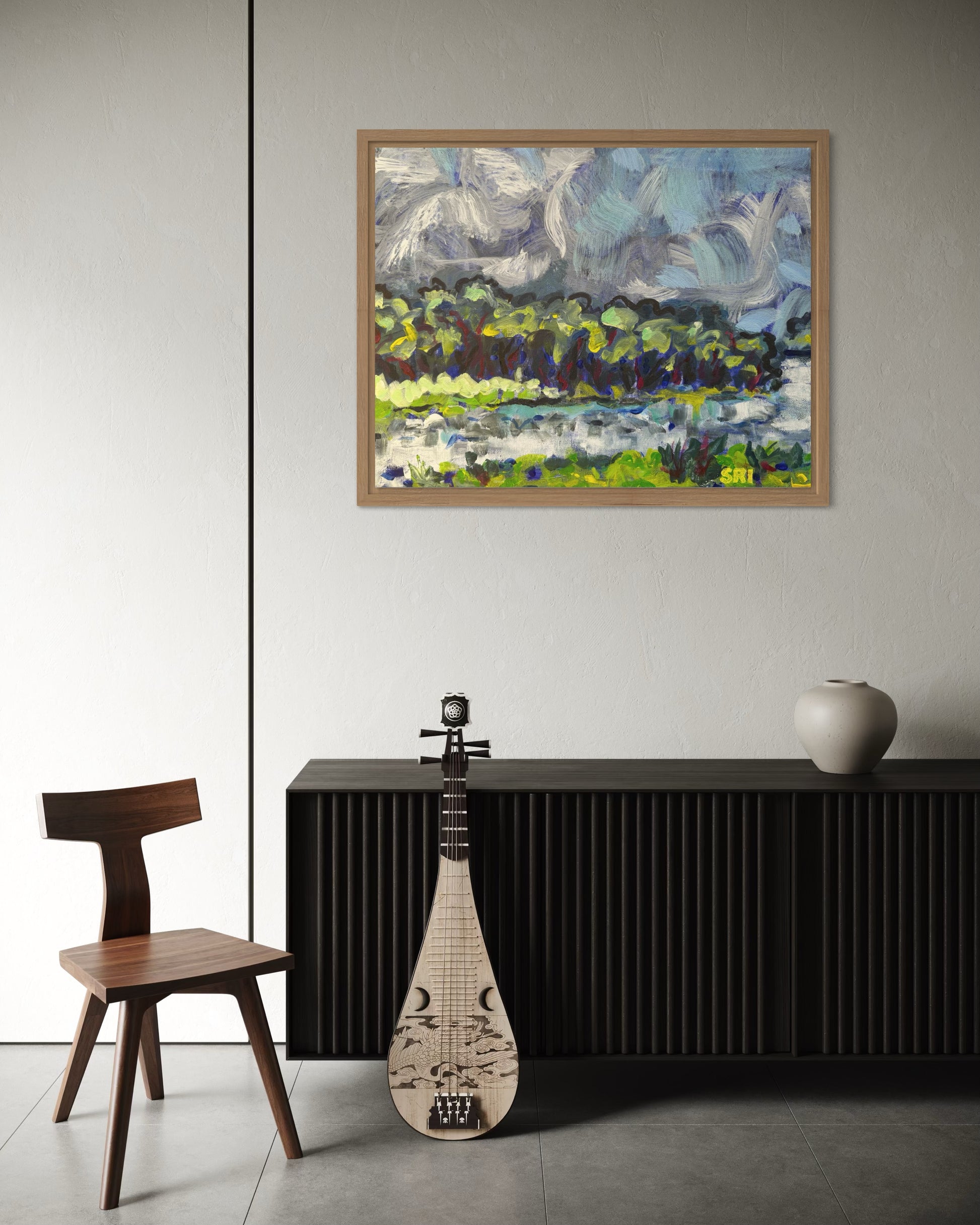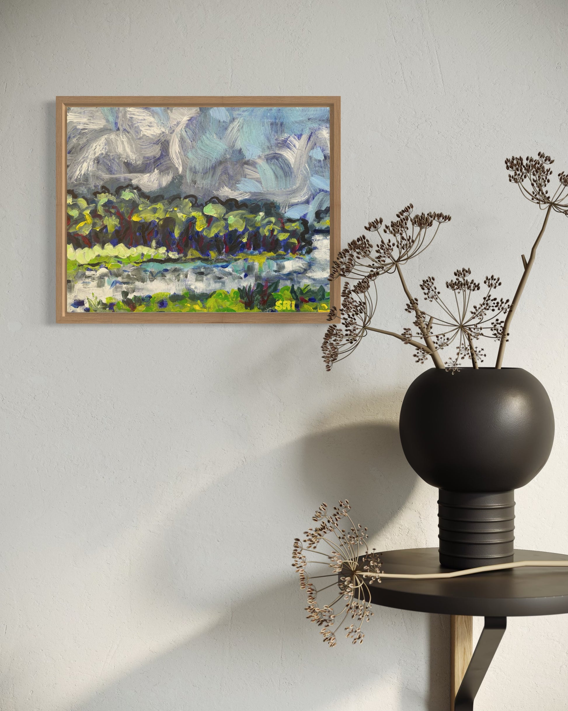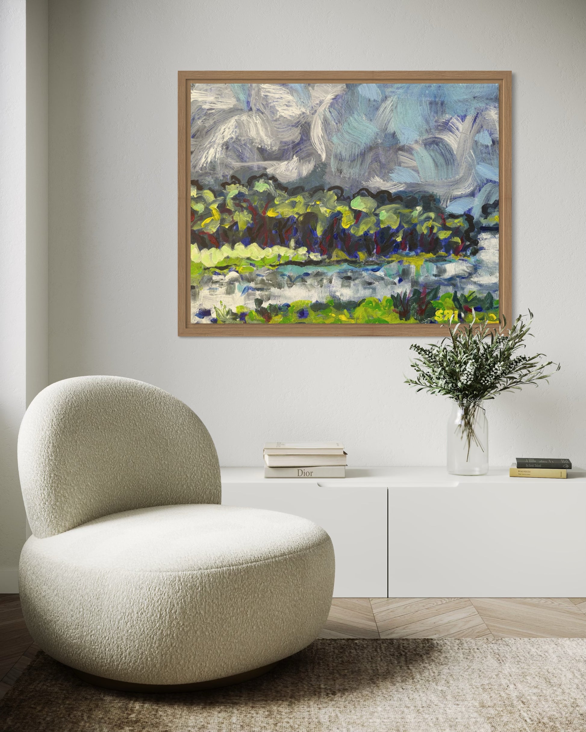 Swirling clouds, trees dancing on the water.