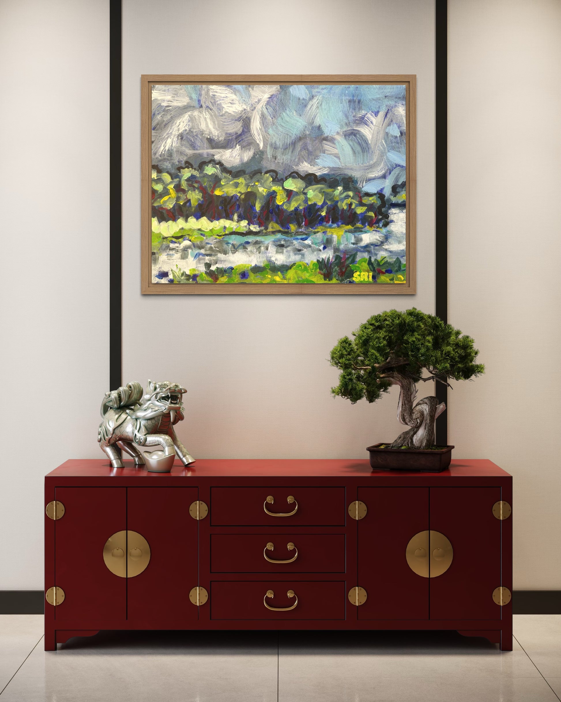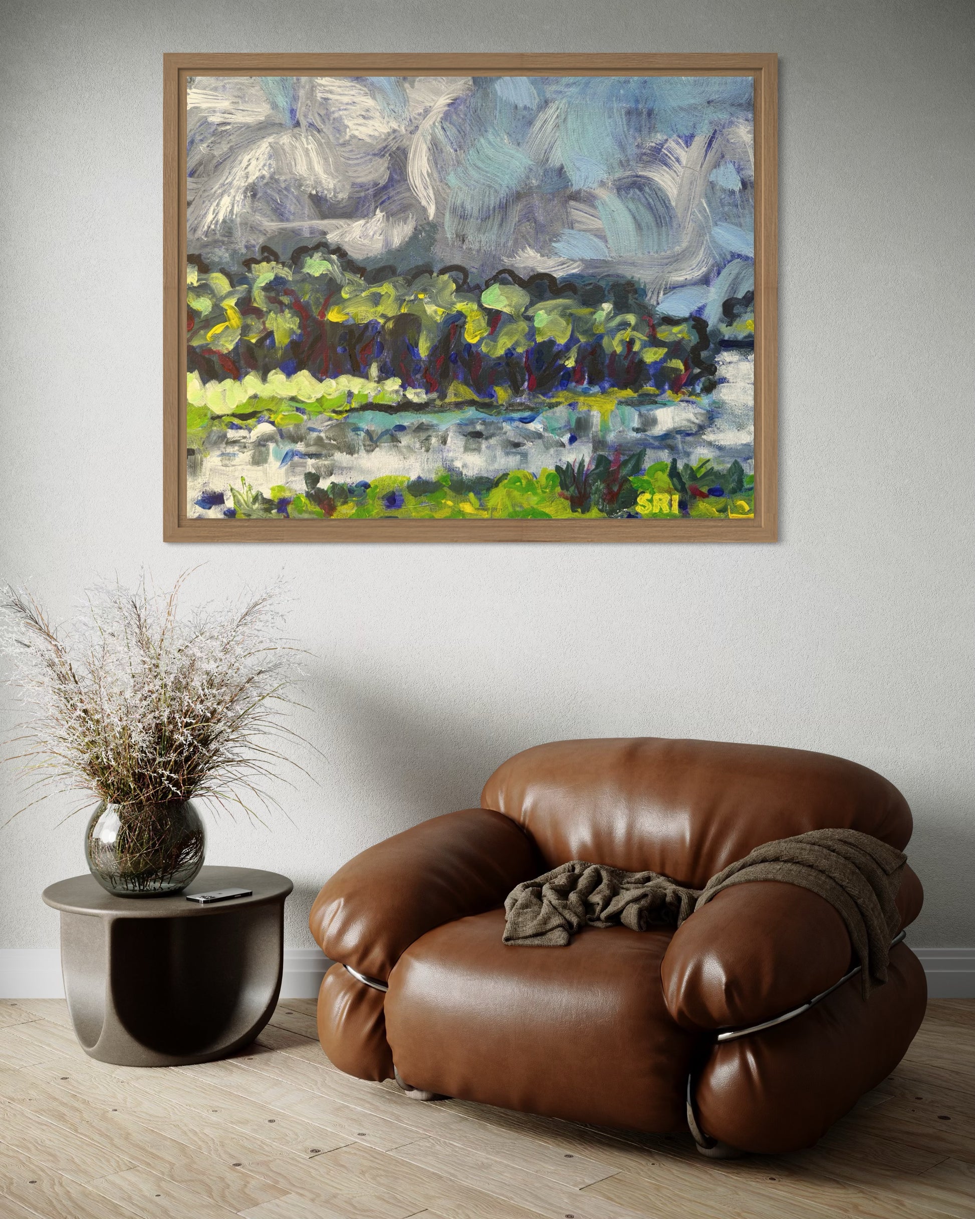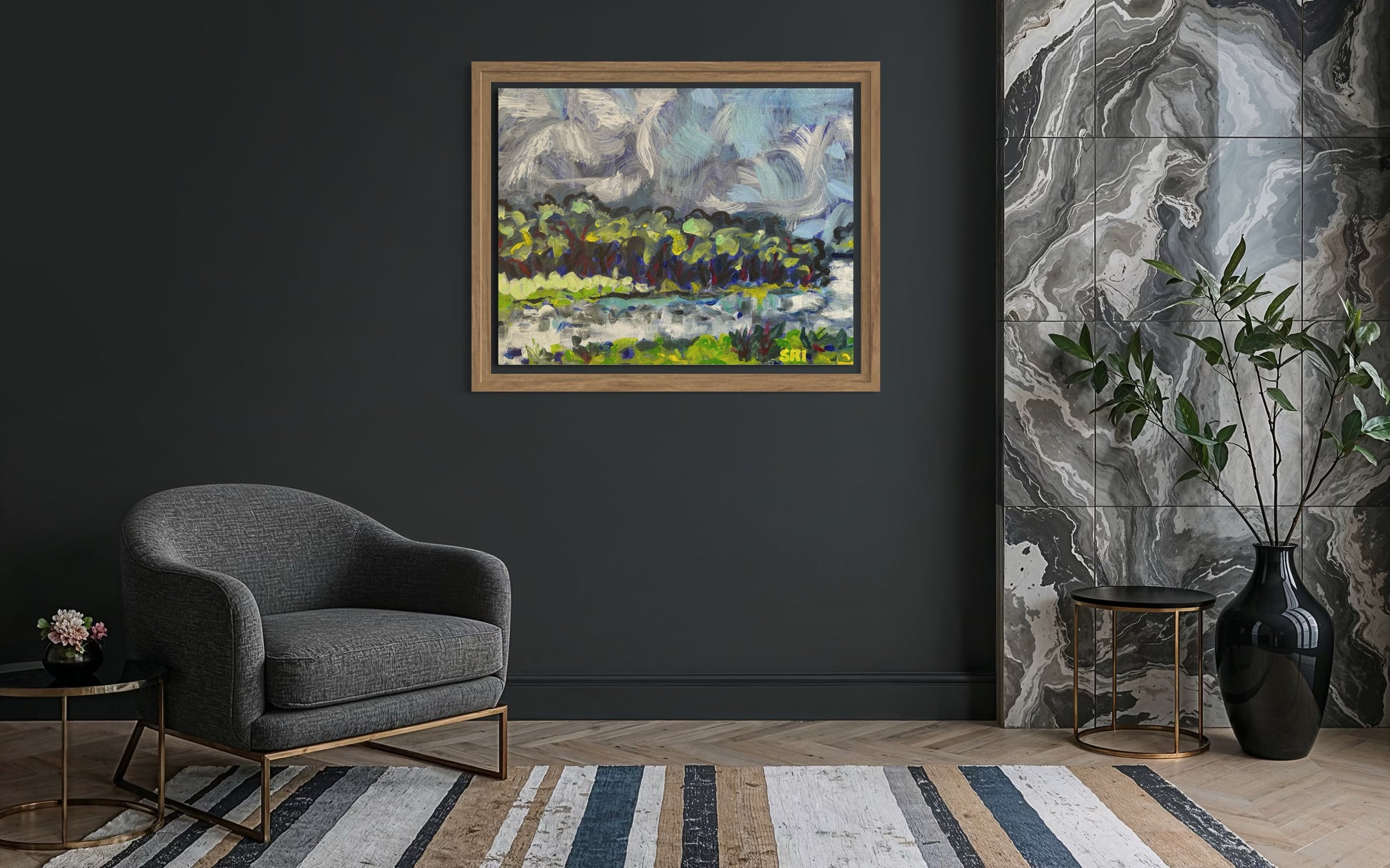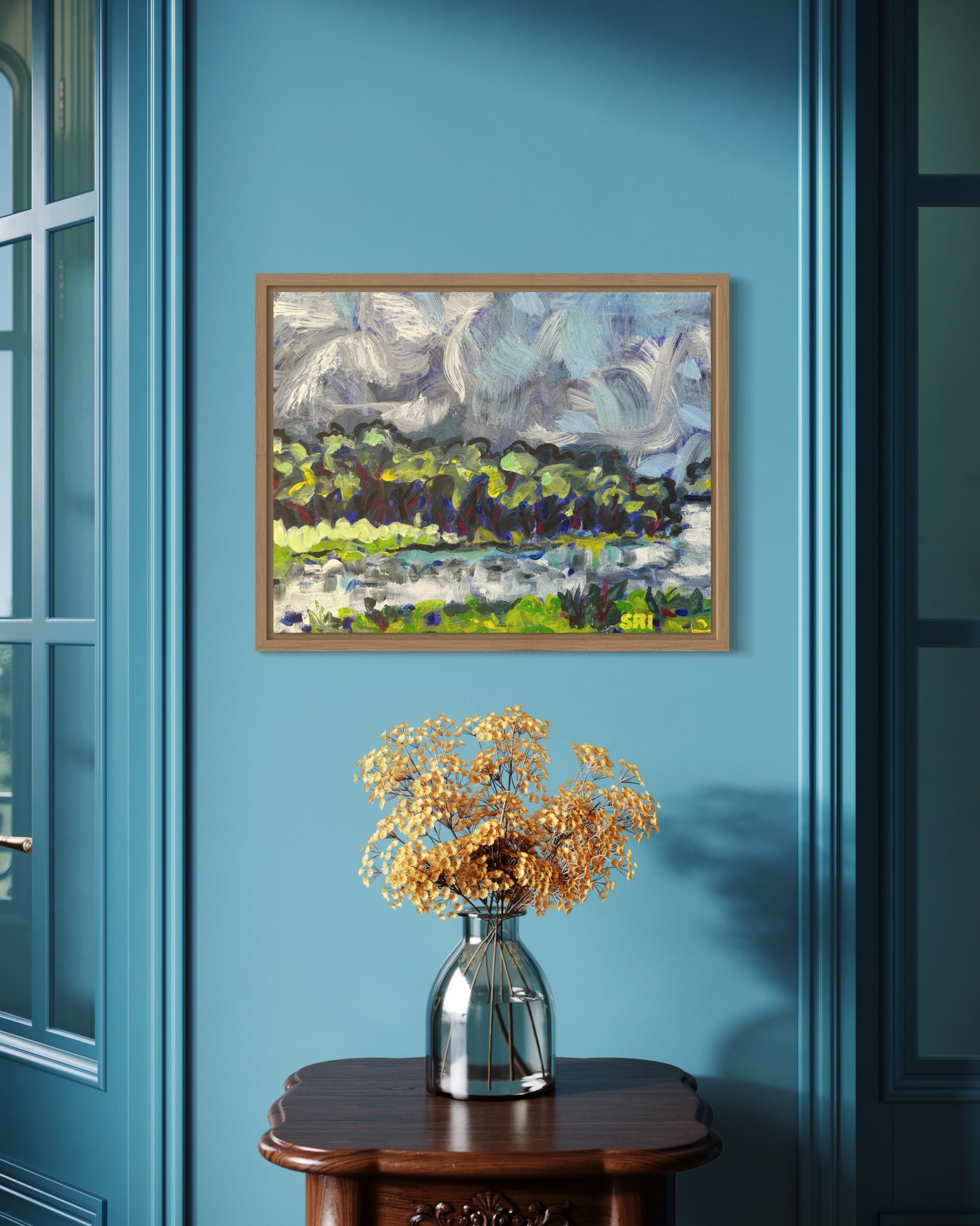 Swirling clouds, trees dancing on the water.