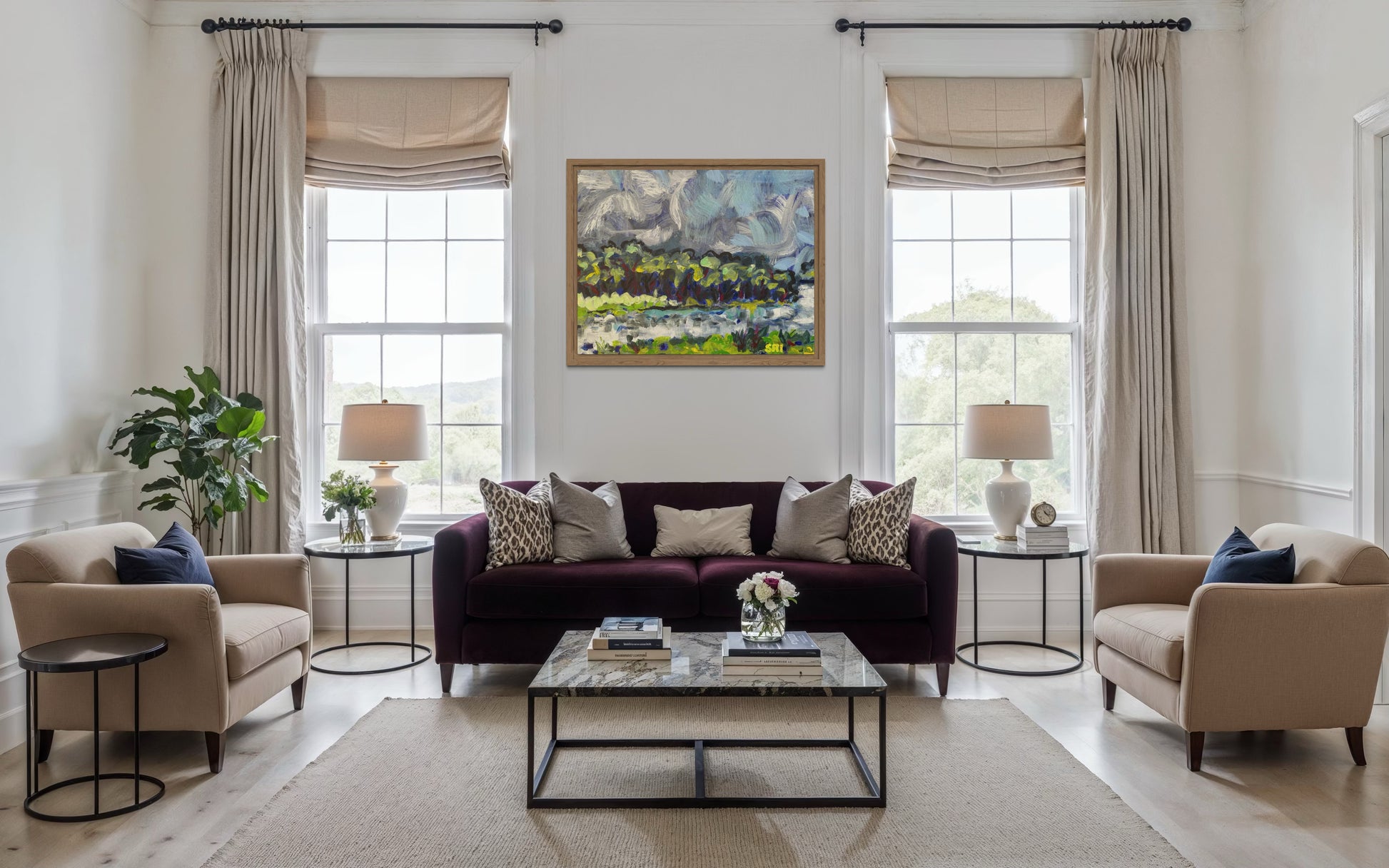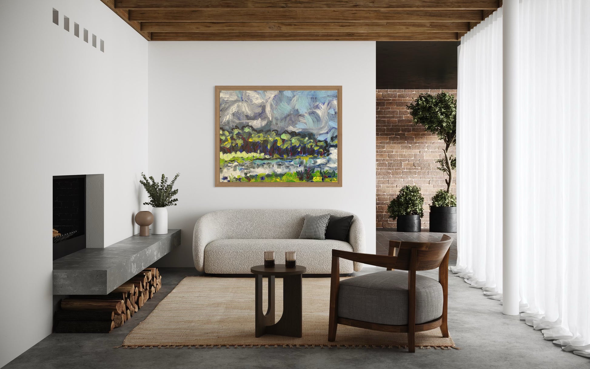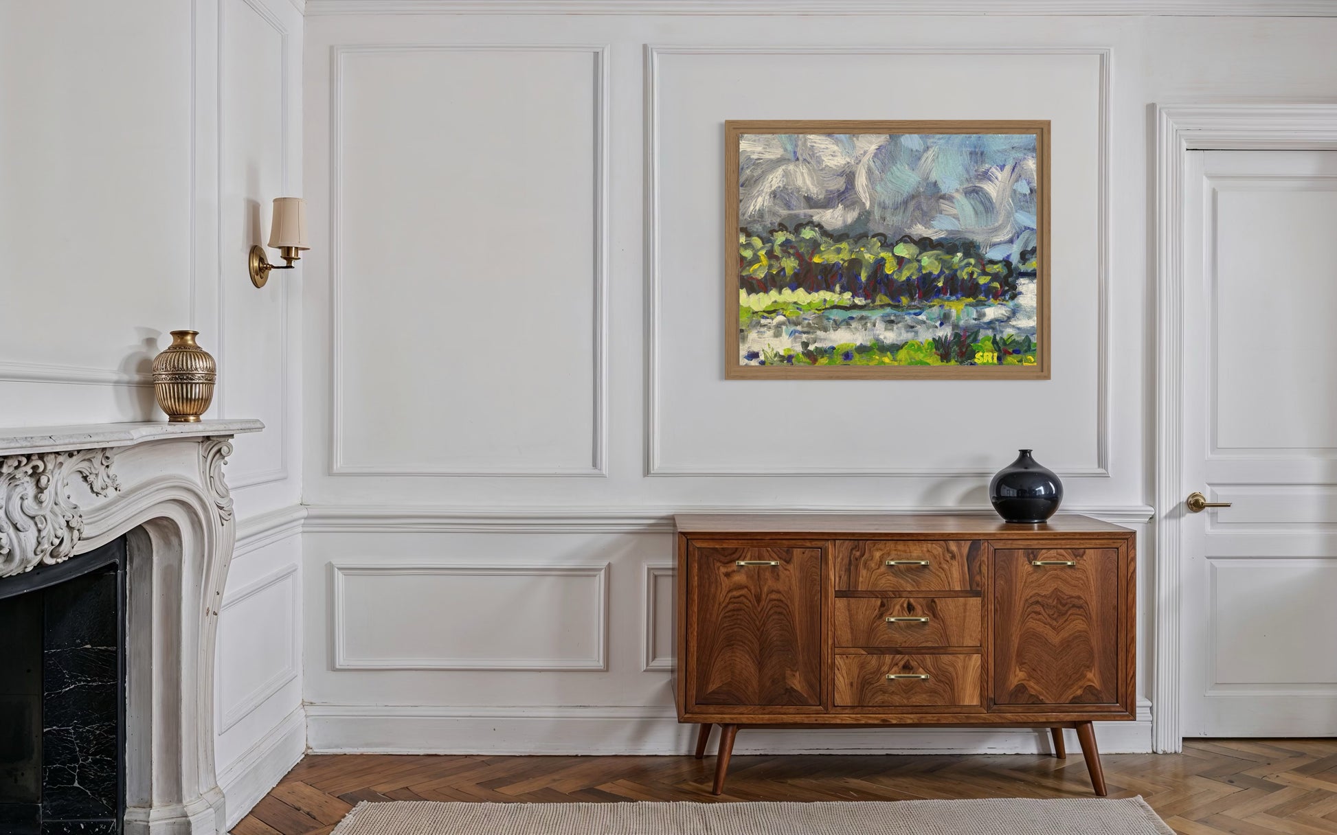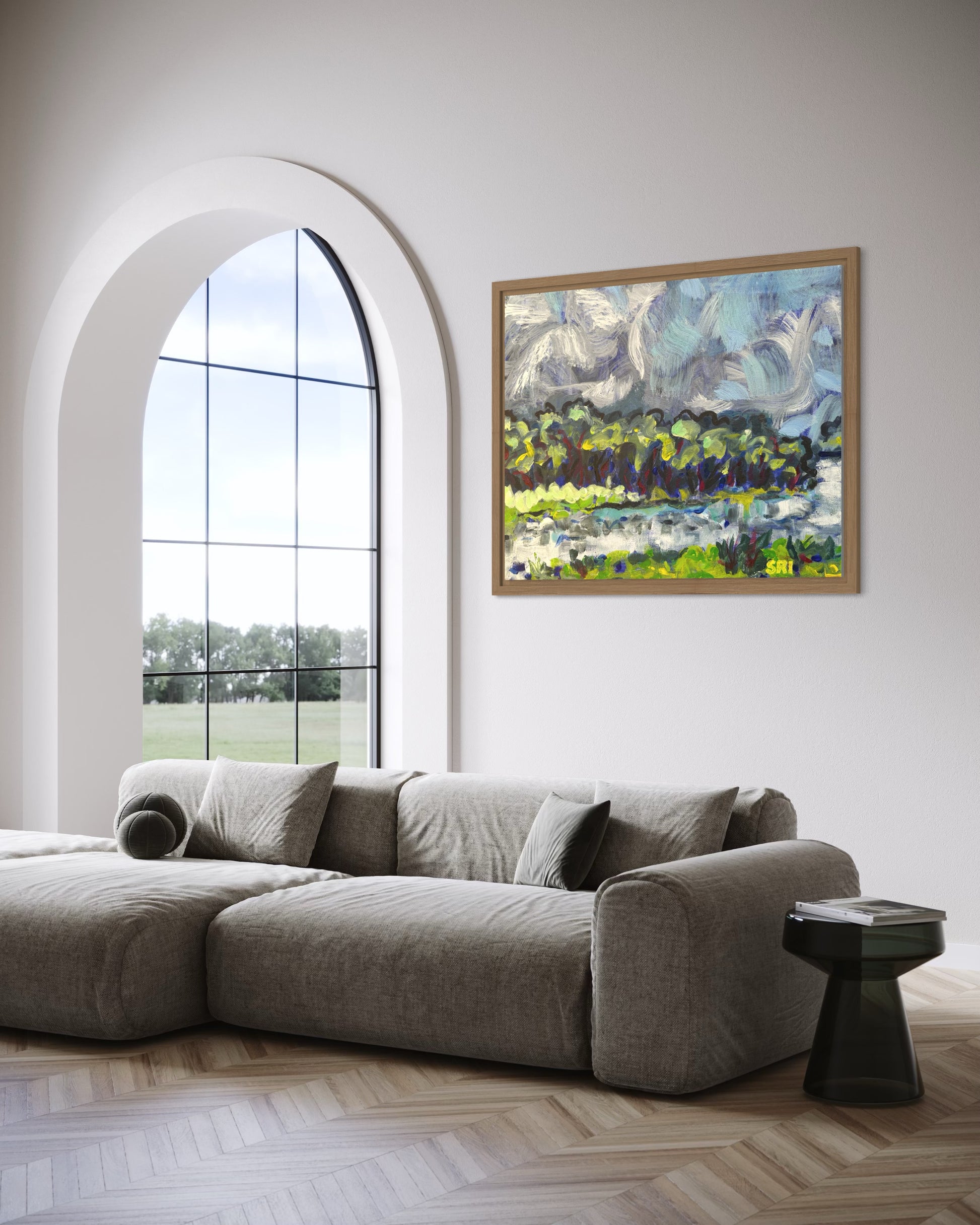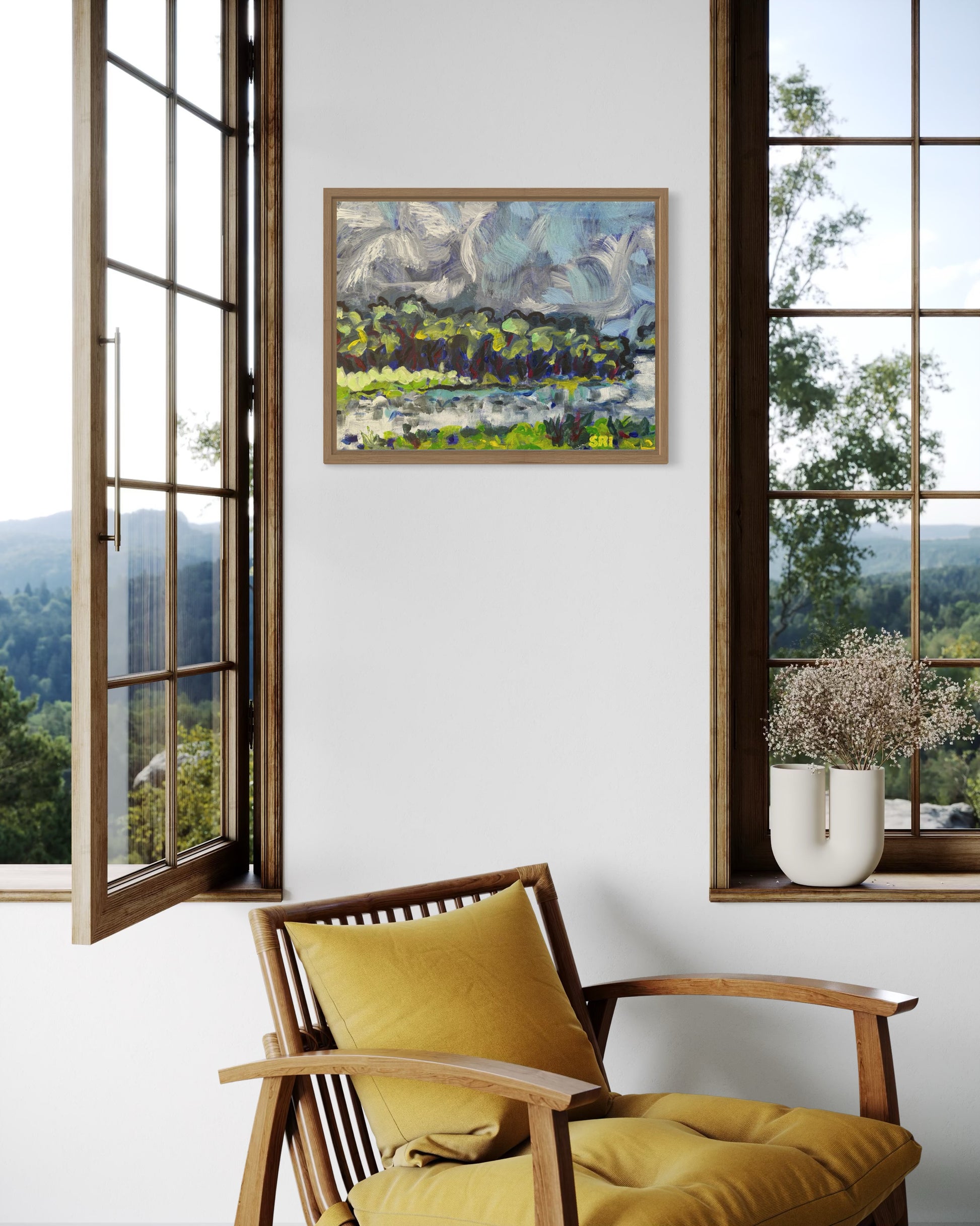 Swirling clouds, trees dancing on the water.